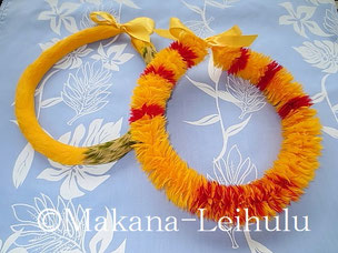 頭や首につけるレイフルは、ポエポエPoepoe(右)とカーモエKamoeという2種類があります。伝統的なスタイルで、王族の女性の装飾品でしたし、現代でもハワイ人の正装に用いられます。