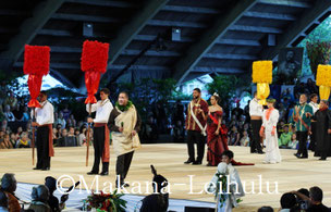上の写真は、メリーモナーク・フェスティバルで王族に扮したロイヤルコートの入場シーン。チャンターに続き、カヒリ持ちの者が王族の前後を守ります。
